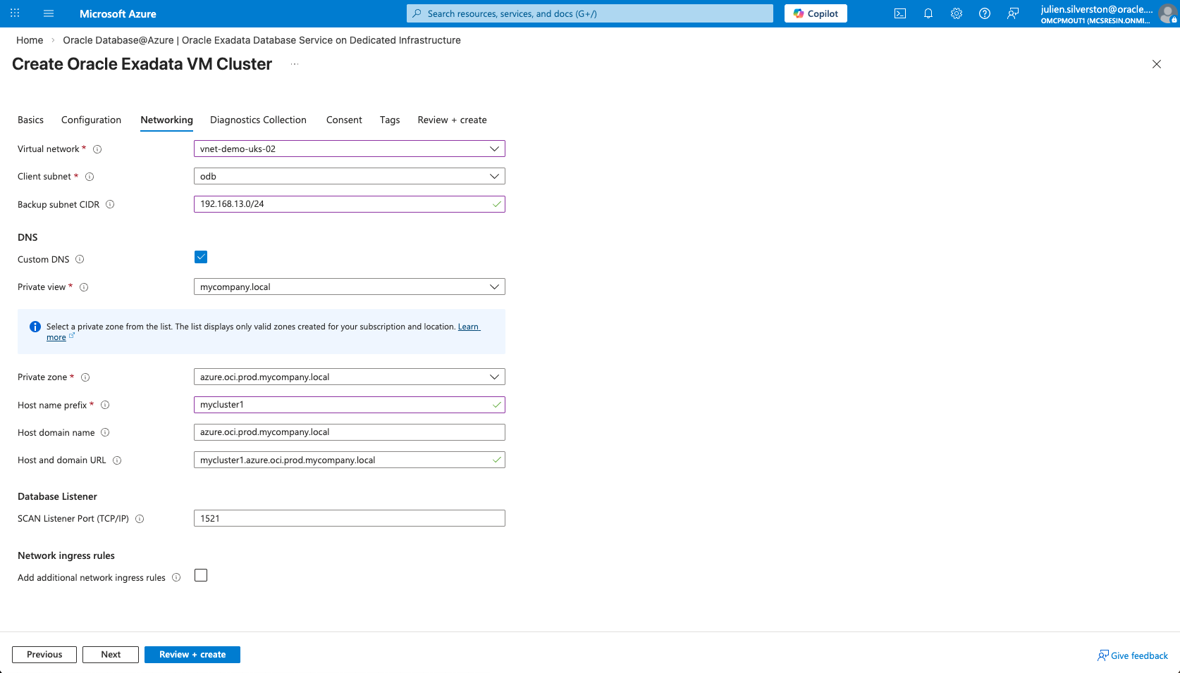 - Manual DNS Record Duplication: Because custom DNS was selected, the oraclevcn.com private zone will not be created in Azure. You must manually duplicate the DNS records for the Oracle Database@Azure SCAN and VIPs from OCI into your production DNS zone (