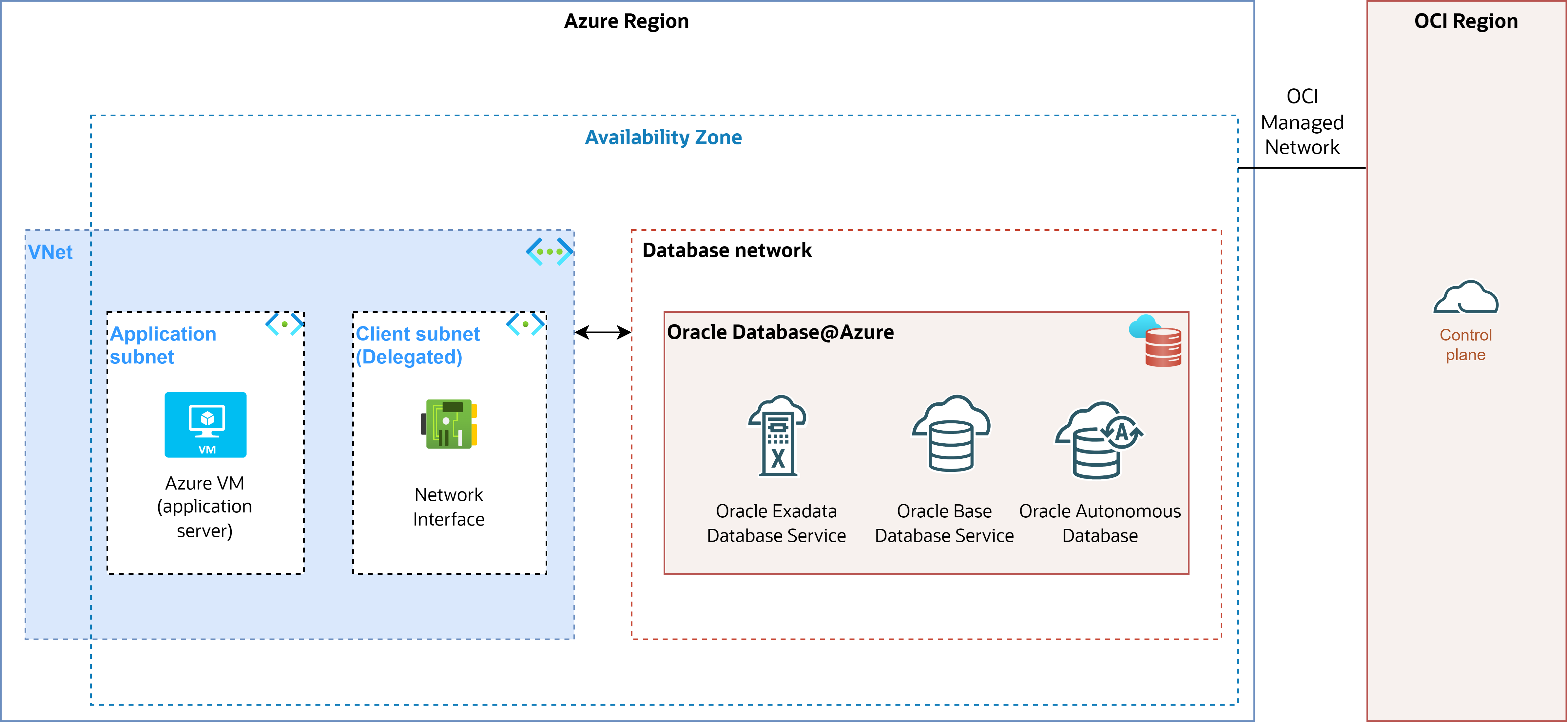 The following high-level architecture diagram shows how an OCI region (parent site) is connected with an Azure region's Availability Zone (child site) through an OCI managed network as part of Oracle Database@Azure. An application server deployed on Azure VM connects to the Oracle Databases deployed in an database network through Delegated subnet. The control plane, which is highly available and fault-tolerant, is deployed in the OCI Region and offers a seamless database management and administration experience.
